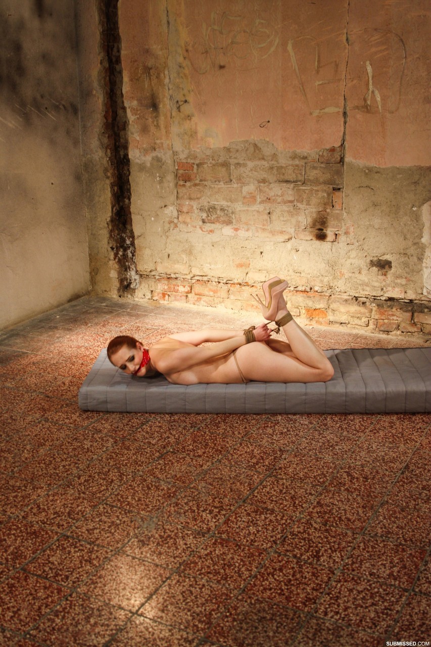 Nude babe Denisa struggles to free-for-all-for-all herself from wire bondage while ball-ball-gagged