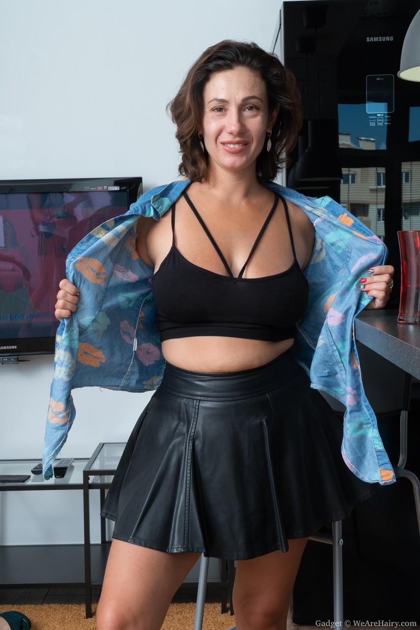 Immense-breasted first-timer Gadget takes off in the kitchen before frolicking with her gash