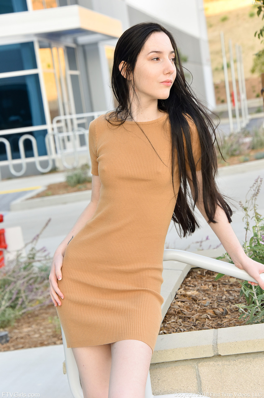 Glamour honey Maia showing her little tits & spreading her sleek-smooth-shaven coochie outdoors