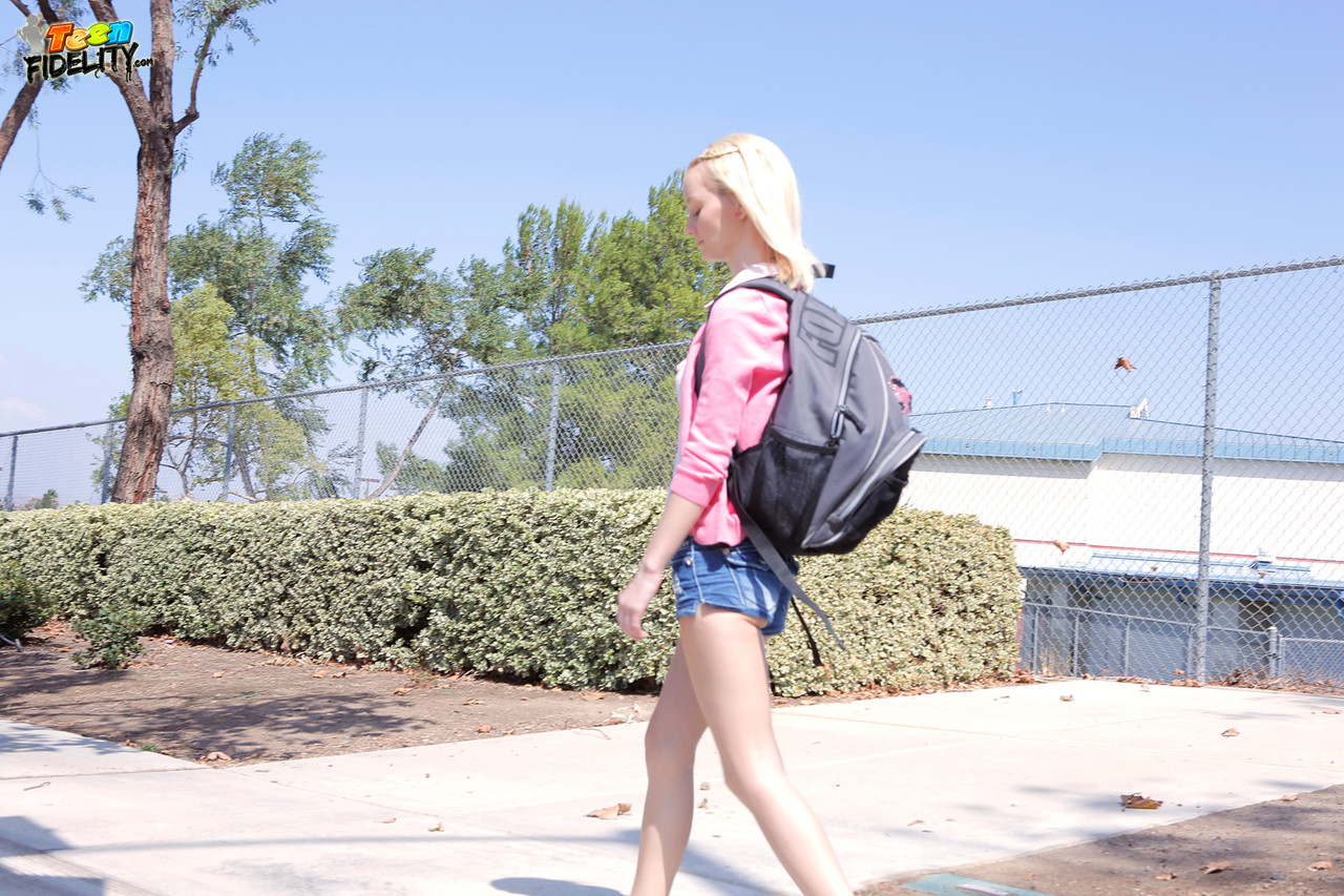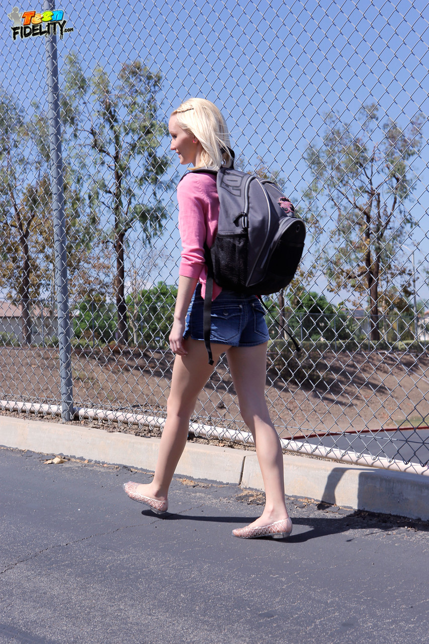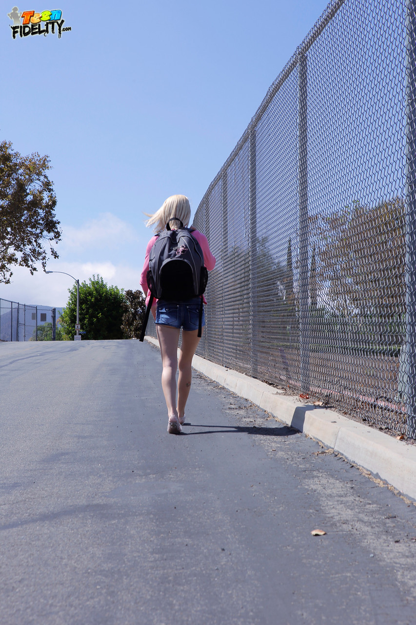 Light-haired teen Sammie Daniels takes a ultra-cute walk after ending her classes