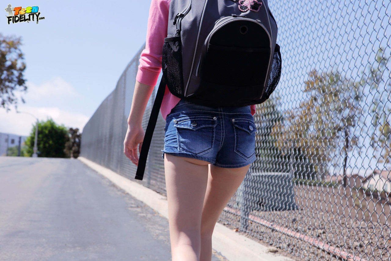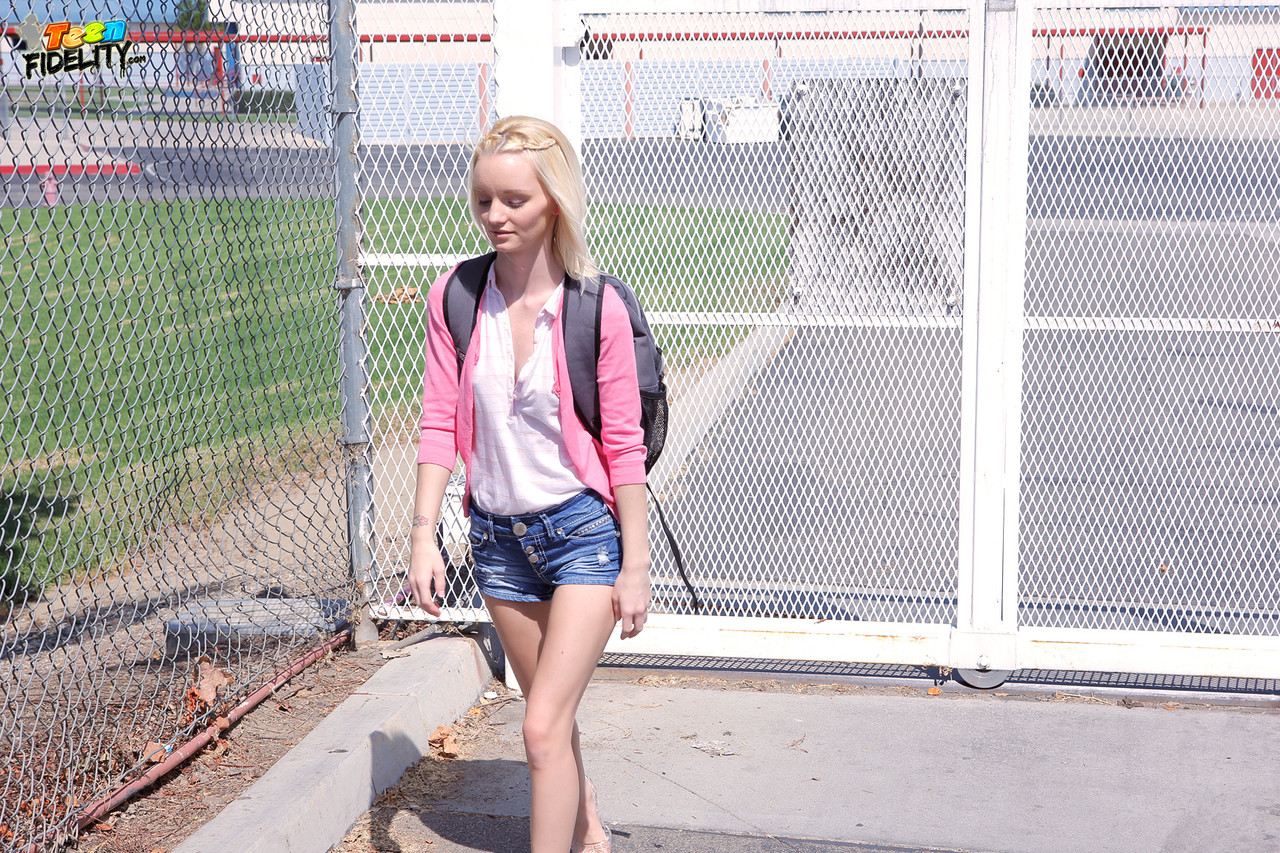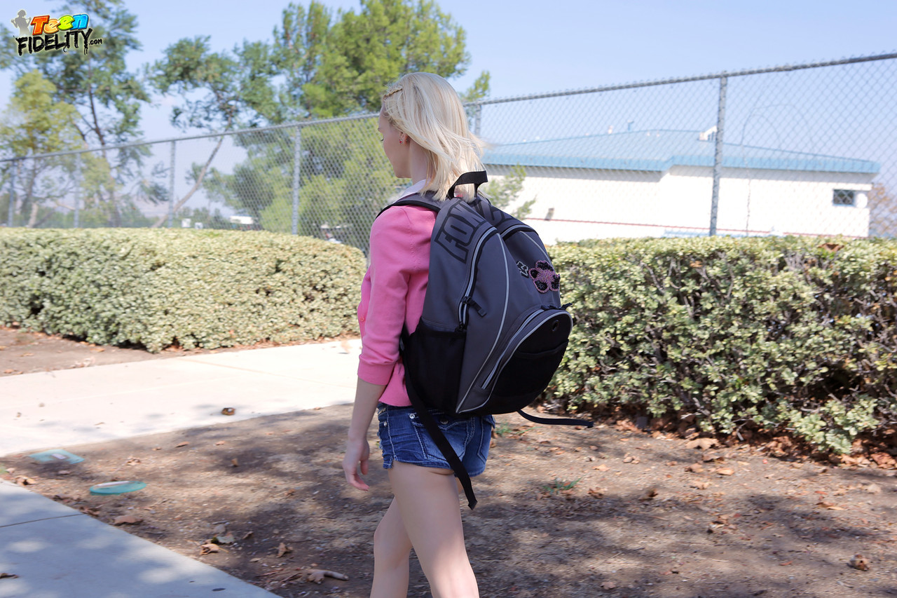 Light-haired teen Sammie Daniels takes a ultra-cute walk after ending her classes