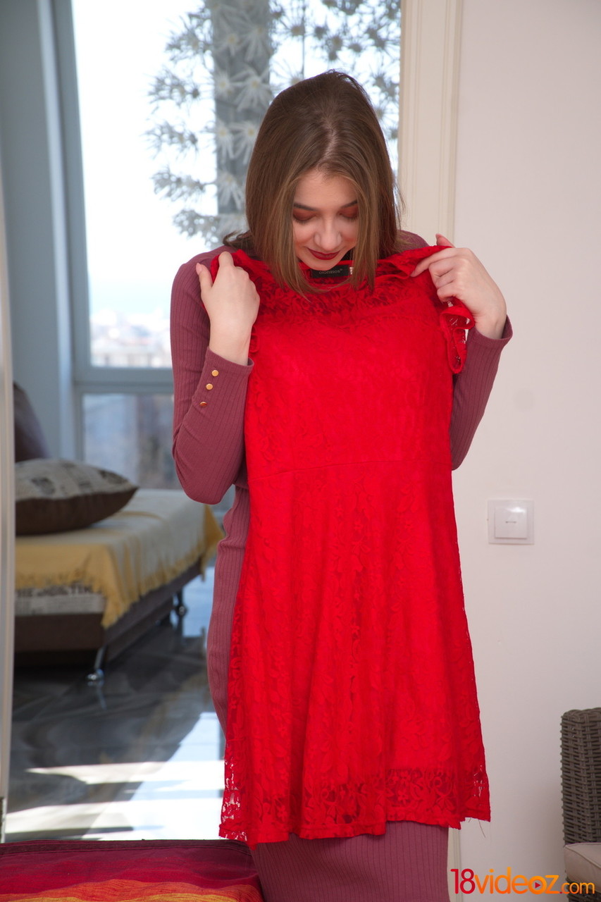 Eliza Thorne seduces her man in a crimson sundress while he watches her age up