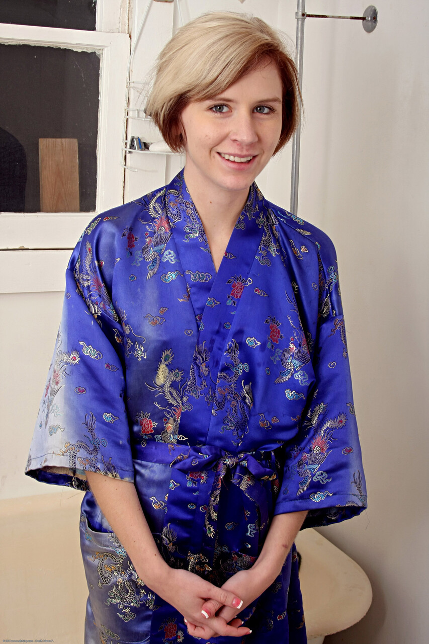 Youthful looking solo doll Lillian parts her pink slit in dark-hued knee socks