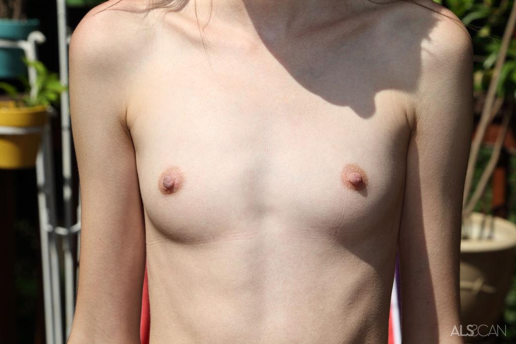 Yummy skinny nubile Ruth displays off her adorable juggs and bald poon on a couch