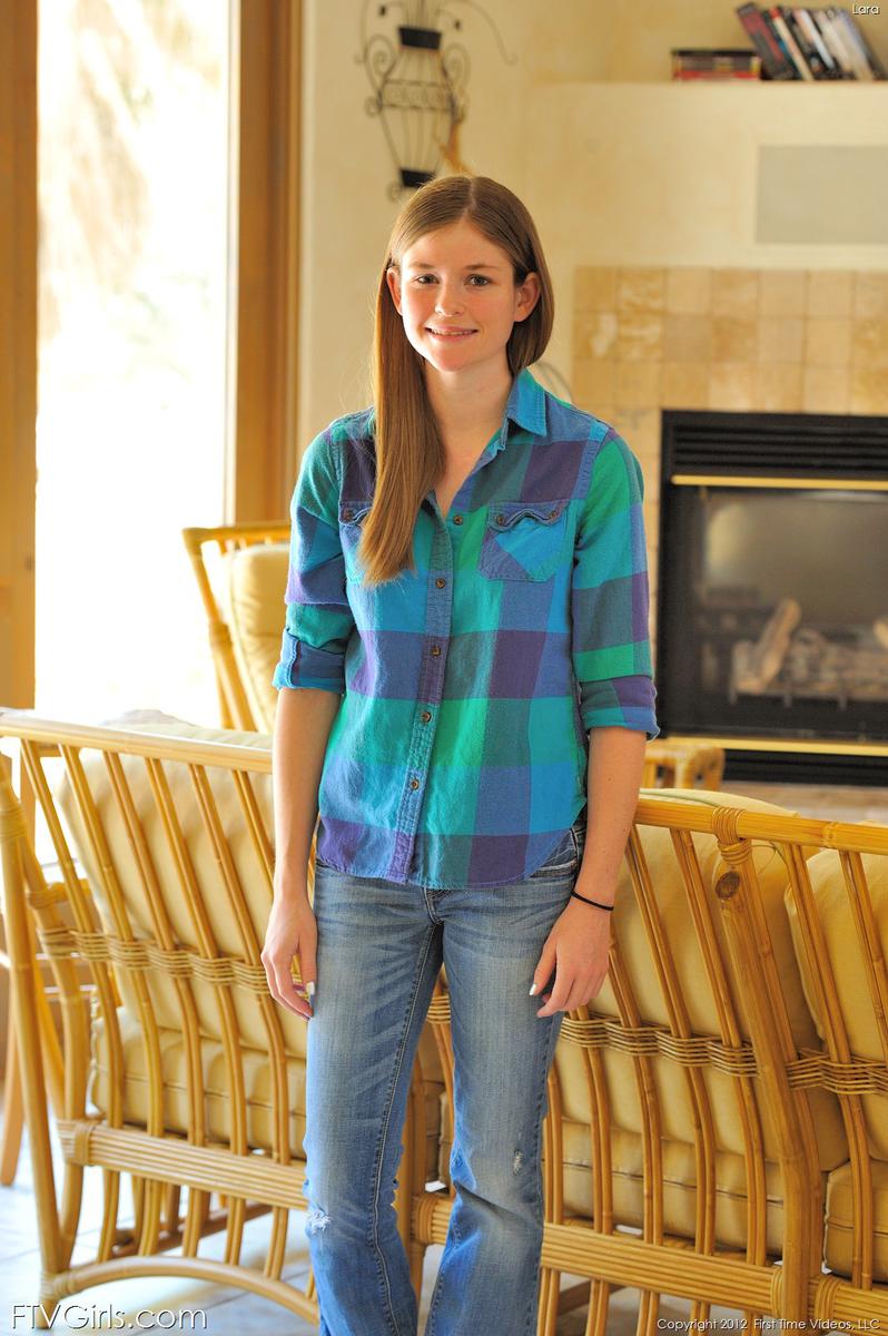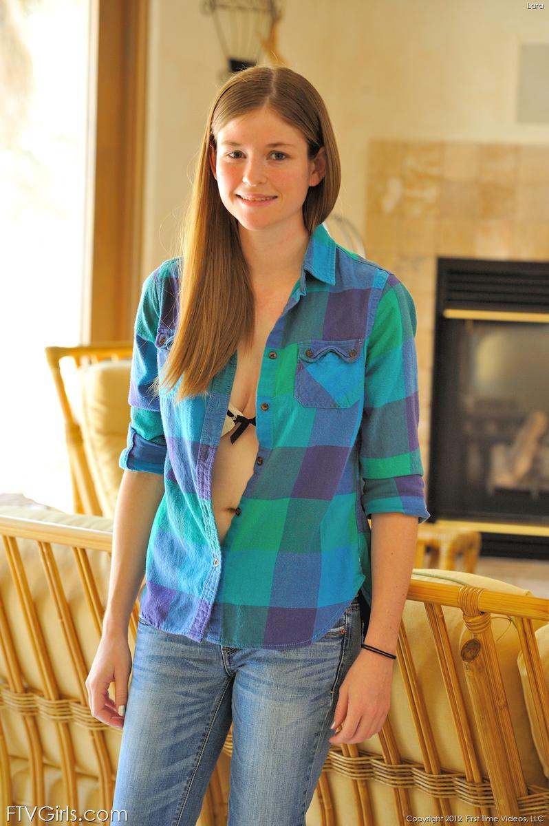 Yummy skinny nubile Ruth displays off her adorable juggs and bald poon on a couch