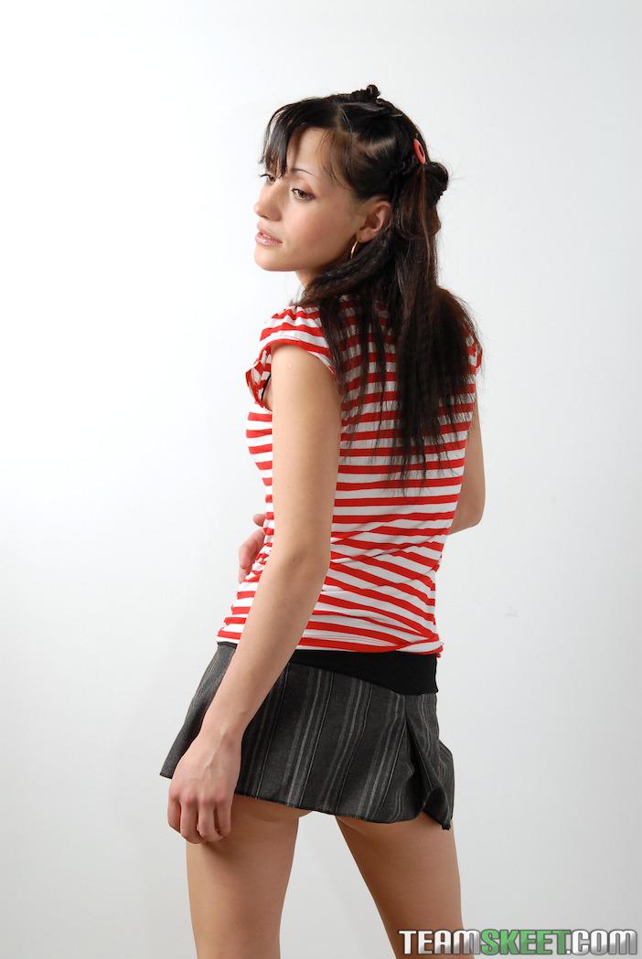 Yummy skinny nubile Ruth displays off her adorable juggs and bald poon on a couch