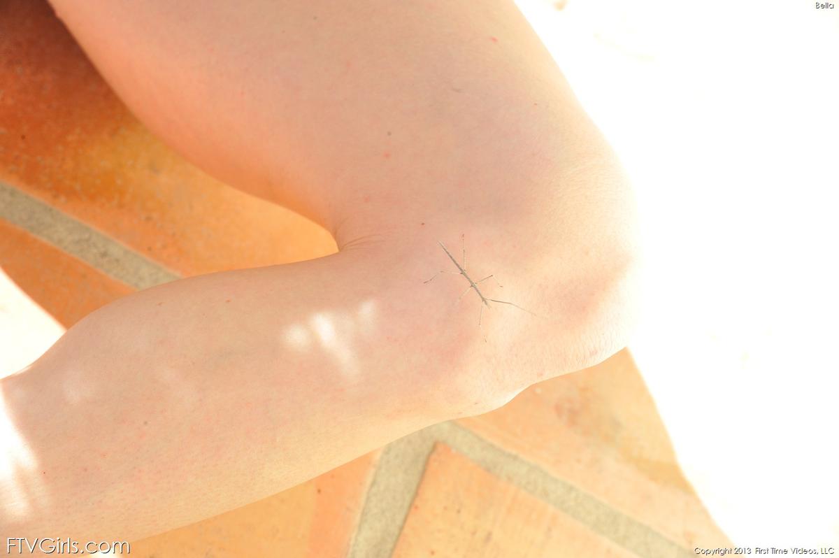 Yummy skinny nubile Ruth displays off her adorable juggs and bald poon on a couch